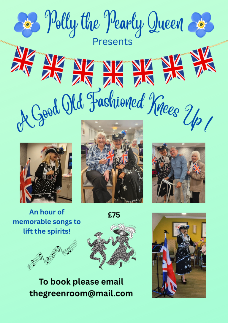 Solo show with “Polly the Pearly Queen” dressed in her finery and singing songs for a good old traditional British knees up! £75